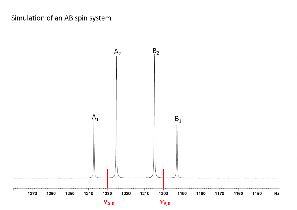 If the coupling constant JAB of two atomic nuclei A and B is in the range of the difference between their Larmor frequencies (Δν=νA-νB), the phenomenon of strong coupling occurs and this is referred to as an AB spin system. If the difference between the Larmor frequencies is significantly greater than JAB (at least more than 10 times), this is referred to as a first-order spectrum and an AX spin system is present, which shows two simple doublets in the spectrum according to the n+1 rule. The NMR spectrum of an AB spin system typically looks like the one shown in the next figure.