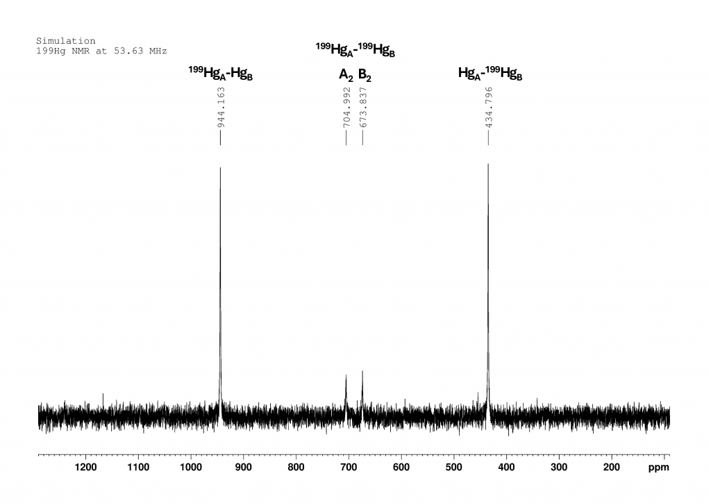 The two large peaks show the signals of 199HgA bound to a non-active Hg (944 ppm) and 199HgB bound to a non-active Hg. The two small peaks in the center belong to the two doublets that are formed by the coupling of two 199Hg atoms. They correspond to peaks νA,0 (705 ppm) and νB,0 (674 ppm) from Figure 2.