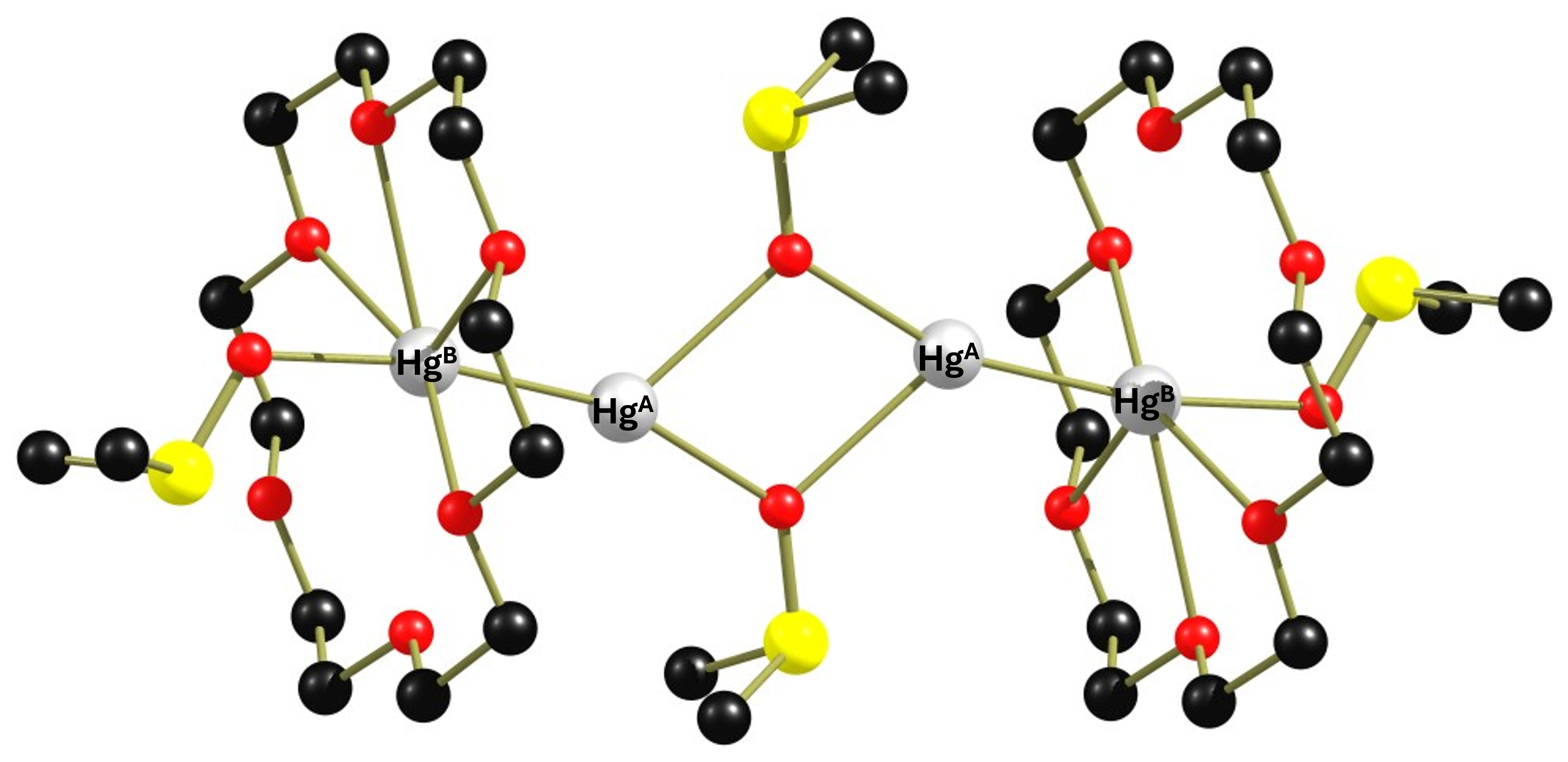 The reaction of a simple Hg2+ salt with elemental mercury and subsequently with the ether 18-crown-6 leads after crystallization from dichloromethane to the complex cation {[Hg2(18-crown-6)2(dmso)(μ-dmso)]}24+(complex 1). The structure of this cation is shown below.