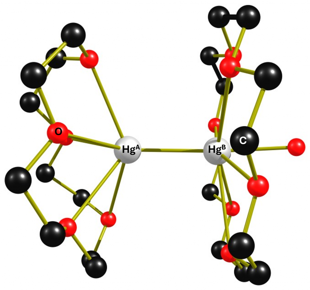 But that’s not the end of the story. The record-breaking result is obtained when complex 1 is dissolved in methanol. In this case, an equilibrium between [(15-crown-5)Hg-Hg(18-crown-6)(dmso)]2+ 2 and [(15-crown-5)Hg-Hg(18-crown-6)(MeOH)]2+ 4 forms in the solution. Unfortunately, the authors do not comment on the position of this equilibrium. Nevertheless, analysis of the 199Hg NMR spectrum of this mixture reveals a 1JHgHg coupling constant of 284100 Hz (±860 Hz) in 4, which is the highest coupling constant recorded to date. Unfortunately, 4 could not be crystallised. Instead, mixed crystals of 2 and 3 were obtained. The water had diffused from the air into the methanol during crystallisation, which did not take place under protective gas.