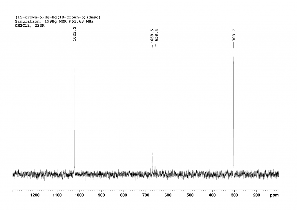 2. In all 199Hg NMR spectra, the mercury signal bound to 18-crown-6 should appear at a low frequency of approximately 300–400 ppm. However, the paper does not explain how this assignment was made. I suspect that the authors also produced the compound [(18-crown-6)Hg-Hg(18-crown-6)(dmso)]2+, in which both Hg atoms are complexed by 18-crown-6, which would make the assignment much more reliable.